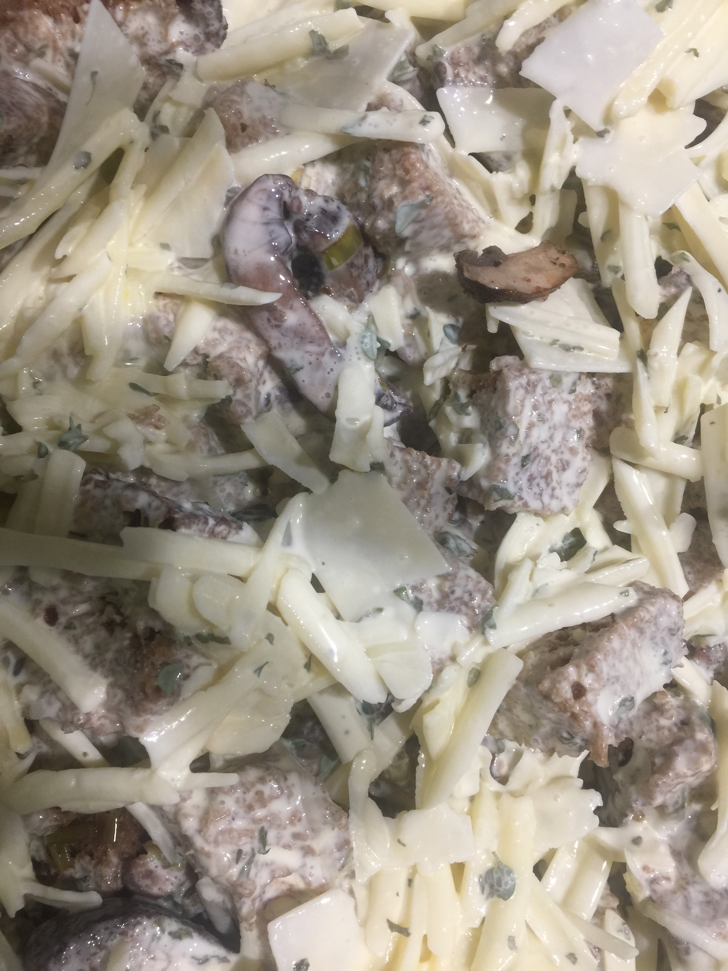 Savory bread pudding with leeks and mushrooms